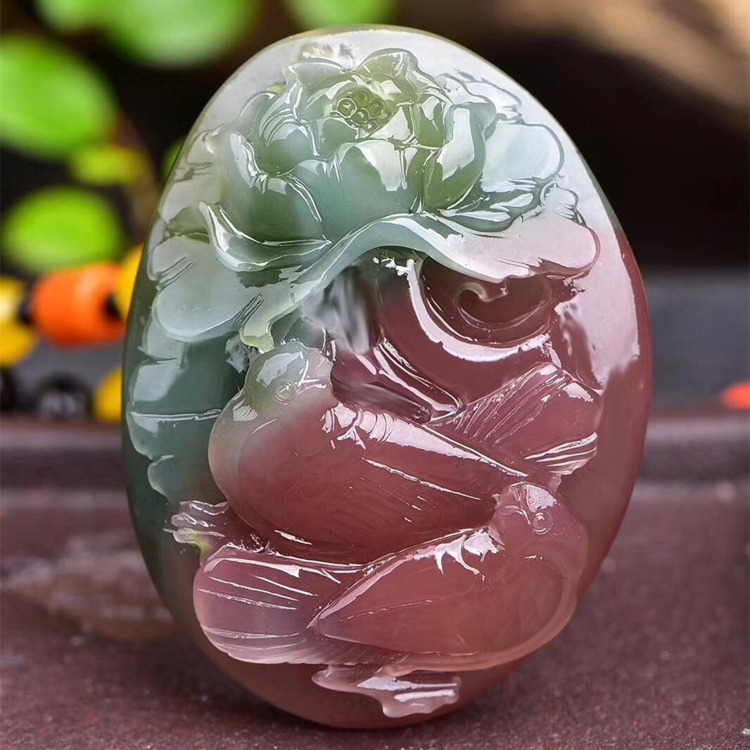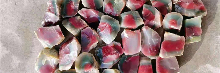 麻花沟紫绿玛瑙整体视觉效果特别醒目,不但色彩丰富,整体还有一种冰冻质感。多数麻花沟紫绿玛瑙红心绿边白皮,而且色彩的层次非常分明。部分麻花沟紫绿玛瑙还会呈现出一料三色甚至是多色。麻花沟紫绿玛瑙原矿品质较高,色纯,底子干净少杂质。麻花沟料同牛槽洼料非常相似,但是其色彩较牛槽洼料偏浅。其中的红色较润,白色同牛槽洼白色的冰料还是有较大区别。虽然麻花沟紫绿玛瑙品质较好,但是其裂多,块小,能成大器的原料较少。在麻花沟偶尔会产出一些天然把玩小玉壶,这些玉壶断面色彩呈同心环状,非常漂亮,是可遇不可求的天然把玩佳品。