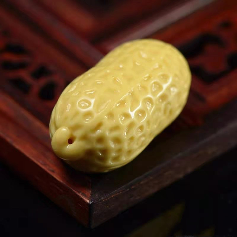 花生果实多籽,常常表达多的意思,寓意的丰收和喜悦。民间花生也被称为“长生果”,象征生命不息,长生不老。玉石中,花生因多籽(子),也表达多子多孙之意,寄托人们对于儿孙满堂的寓意。金膏玉色黄而质感温润,用来做花生题材再合适不过,形态可爱,寓意美好。