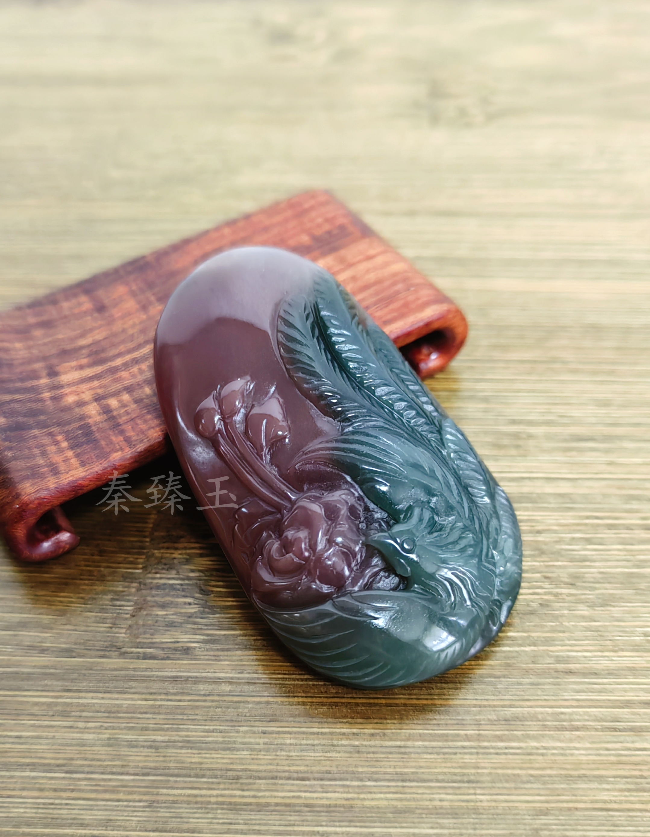 我们常常在紫绿玛瑙玉雕中看到凤凰的影子,凤凰是“凤”与“凰”两种五彩鸟,是中国神话传说中的百鸟之王,在中华文化中地位仅次于龙。它们身披五彩羽毛,羽冠盛水,能翱翔四海。古人认为时逢太平盛世,便有凤凰飞来,是为有凤来仪,必为丰收祥和之年。凤凰其标准造型鸿头、鸡嘴、燕下巴身如鸳鸯,翅似大鹏,腿如仙鹤,是众多禽鸟的结合,是“羽虫”之长,所以和“鳞虫”之长的龙在传说中就成了相辅相成的一对,一个变化多端,一个德性美好,所以龙与凤就成了玉雕作品中常见到的题材之一,有着龙凤呈祥的美意。《山海经》上说:“凤鸟首文曰德,翼文曰顺,膺文曰仁,背文曰义,见则天下和。”凤凰是完美主义的化身,千百年来,凤凰在国民的心目中,一直被视为美丽、吉祥、善良、宁静、有德、自然,顺天道、尚人文、致太平、向光明的象征。