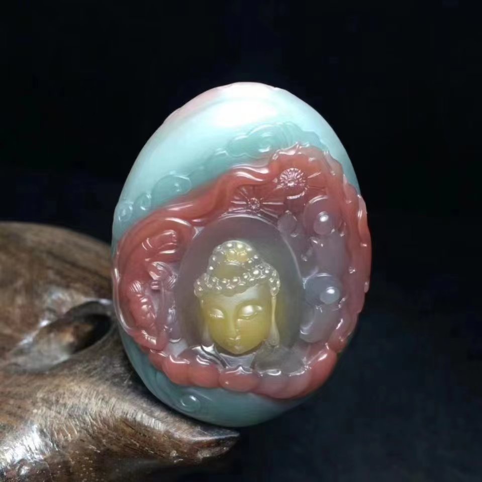 图中是太平山紫绿玛瑙所雕紫绿黄四色观音吊坠。该雕件工艺水平一般,特点是整体玉雕有紫、绿、黄、白四色,同一原石有三色比较少见,能够成玉雕的四色非常稀少。目前来说,这种三色以上的紫绿玛瑙也只有在太平山坑口大概率出现。